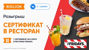 - Подпишись на группу ВК Биглион (https://vk.com/biglion) и группу ВК FRIDAYS (https://vk.com/tgifridays_ru)